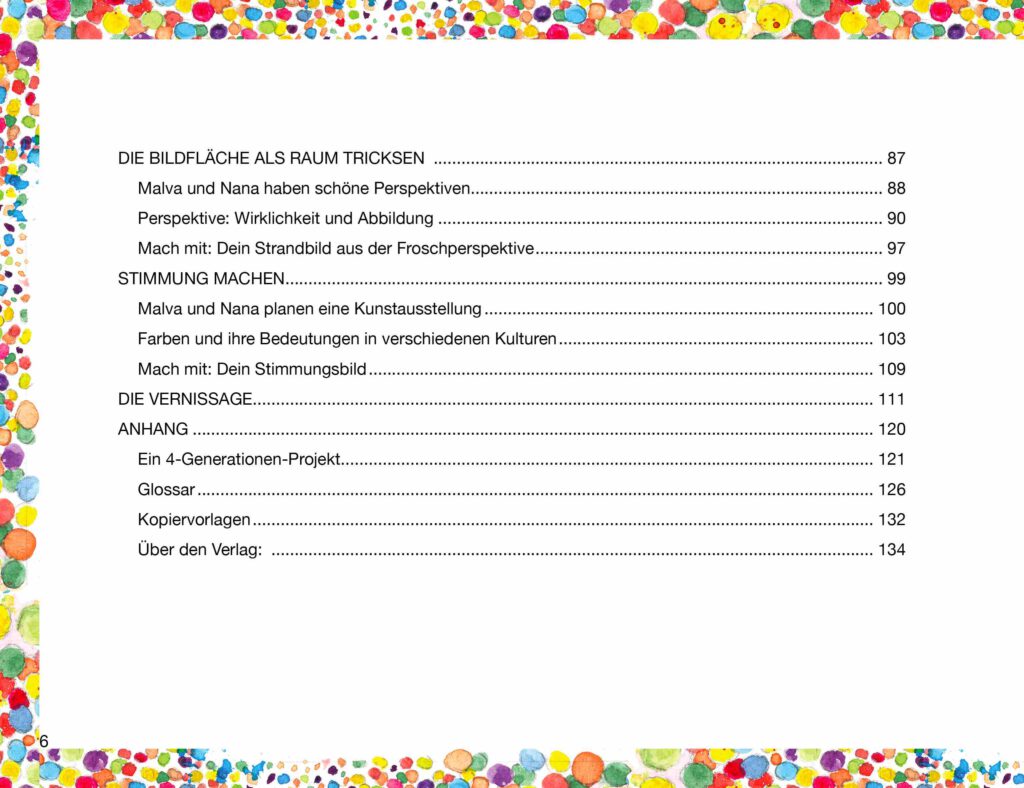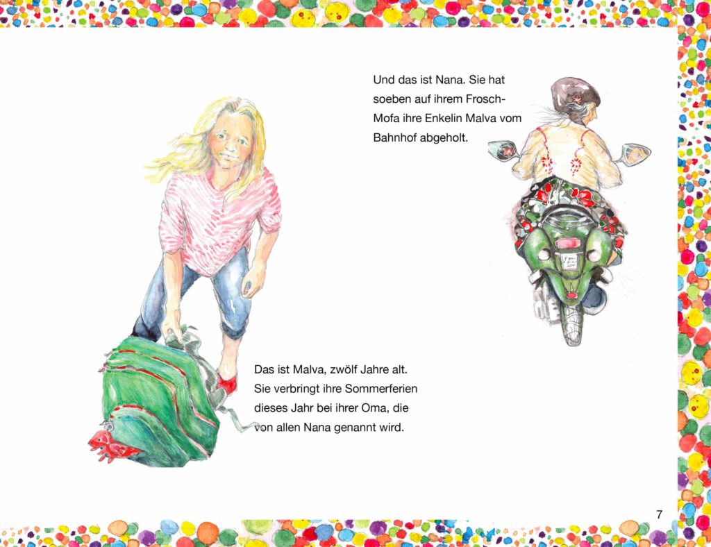 So hat sich Malva die Sommerferien nicht vorgestellt! Sie soll die ganzen Ferien bei ihrer Oma „Nana“ auf dem Land verbringen. Doch anstatt der befürchteten Langeweile erlebt sie etwas Tolles: Beim Aufräumen in einem alten Atelier bringt ihr Nana alles über das Malen und die Kunst bei. Farbenlehre, Perspektive, Bildkomposition, Aquarelltechnik – Schritt für Schritt lernt Malva eine neue Welt voller Farben, Kreativität und Kunstbegeisterung kennen.